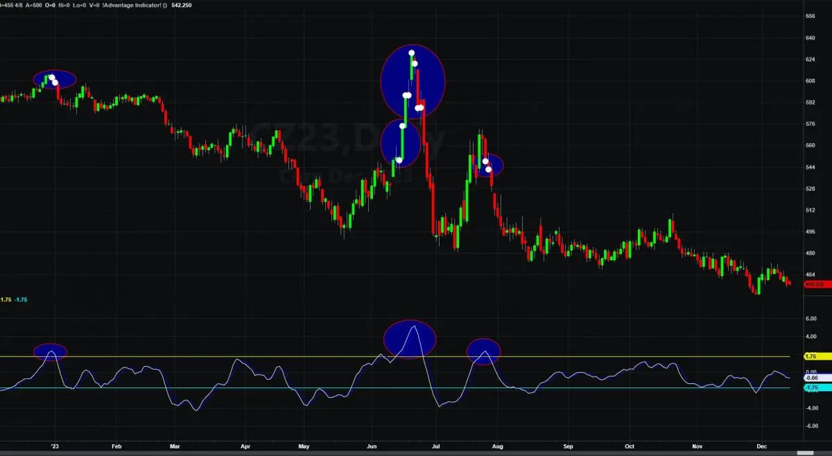 Advantage Alerts give producers opportunities to sell their grain after the market has rallied significantly to the upside. When the market is moving significantly higher than the past month of trading the indicator is triggered and a text message is sent to producers to notify them of a cash grain selling opportunity in corn or soybeans. Patrick developed The Advantage Indicator as a tool to help producers feel more confident about the timing of their corn and soybean sales. In 2023 the Advantage Alerts days averaged $5.85 per bushel while the average for the December contract was $5.25. More details on each selling recommendation are given inside of our daily trading newsletter. Sign up for our newsletter here to gain access to the alerts.