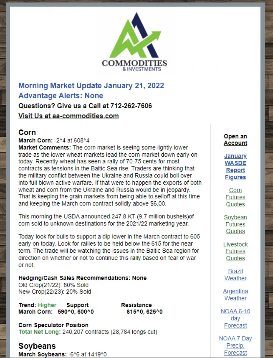 Sign up for a free trial of our Morning Market Update Newsletter and Advantage Alert System! The one-page newsletter comes to your inbox each morning and highlights current events, fundamentals, and trends in the grain markets. Signing up below gives you trial access to both the Newsletter and the Advantage Alerts System!